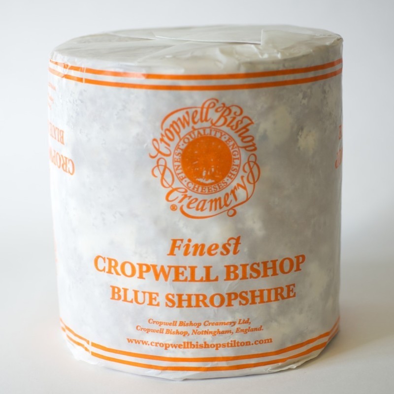 Cropwell Bishop Shropshire Blue has an orange-coloured blue cheese, smooth and mellow with a natural coat and blue veining.